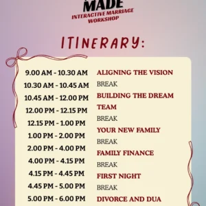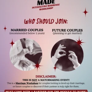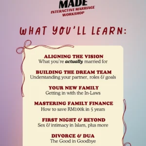 𝐌𝐚𝐭𝐜𝐡 𝐌𝐚𝐝𝐞 is an interactive marriage workshop that scoops directly from the Quran & Hadith to help you & your partner with proper vision-boarding, navigating friction points, planning money matters, managing in-laws, and so much more!